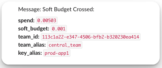 spendfloat: The current spend amount for the 'event_group'.max_budgetfloat or null: The maximum allowed budget for the 'event_group'. null if not set.tokenstr: A hashed value of the key, used for authentication or identification purposes.customer_idstr or null: The ID of the customer associated with the event (optional).internal_user_idstr or null: The ID of the internal user associated with the event (optional).team_idstr or null: The ID of the team associated with the event (optional).user_emailstr or null: The email of the internal user associated with the event (optional).key_aliasstr or null: An alias for the key associated with the event (optional).projected_exceeded_datestr or null: The date when the budget is projected to be exceeded, returned when 'soft_budget' is set for key (optional).projected_spendfloat or null: The projected spend amount, returned when 'soft_budget' is set for key (optional).eventLiteral["budget_crossed", "threshold_crossed", "projected_limit_exceeded"]: The type of event that triggered the webhook. Possible values are:- "spend_tracked": Emitted whenver spend is tracked for a customer id.